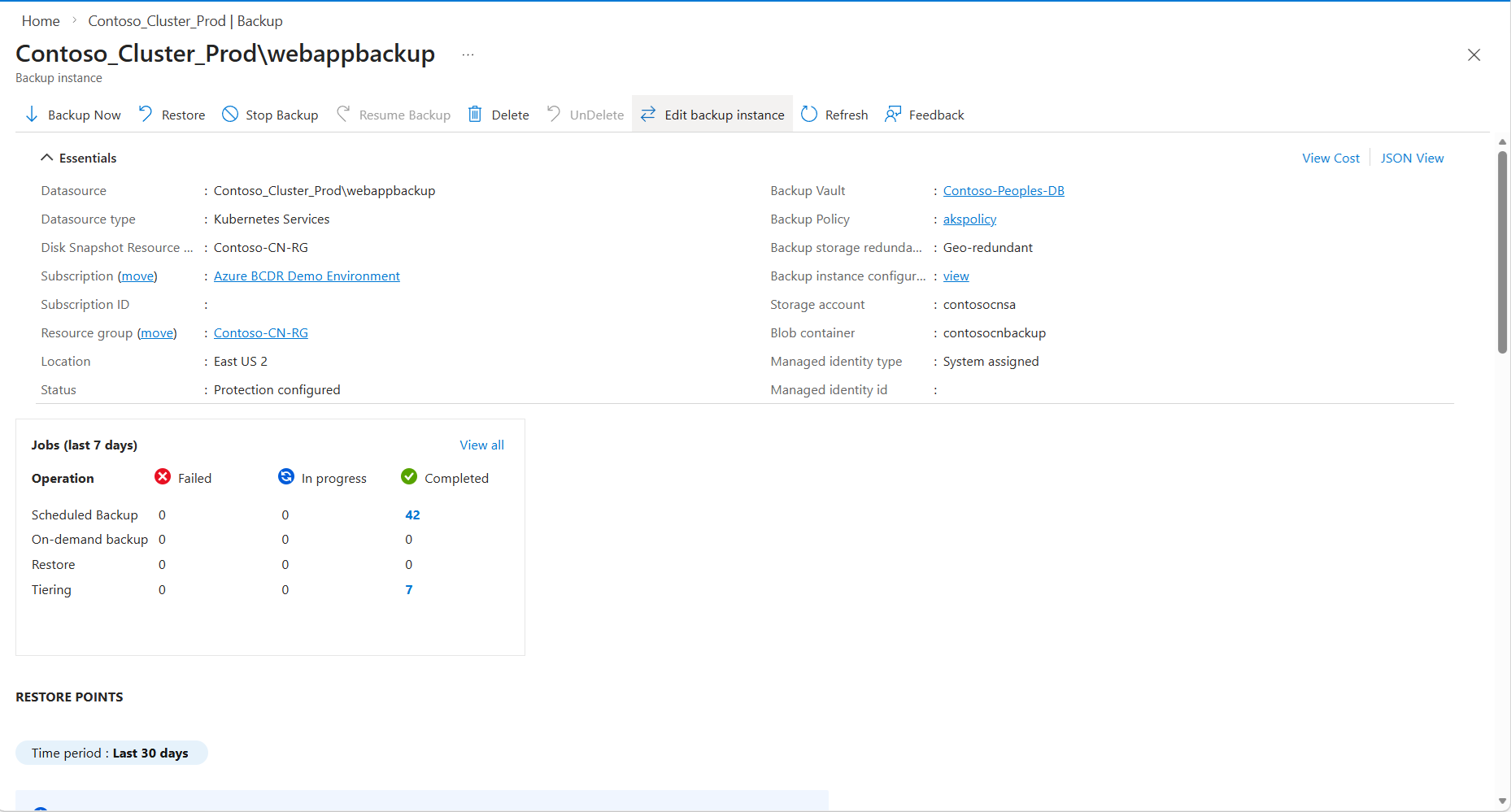 Trovare l'istanza di backup del cluster AKS, aprirla e fare clic su Modifica istanza di backup in alto.