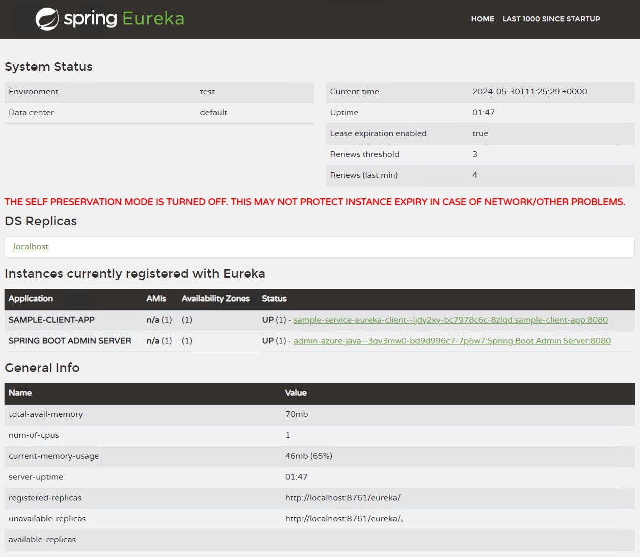 Screenshot del dashboard di Eureka Server per Spring.