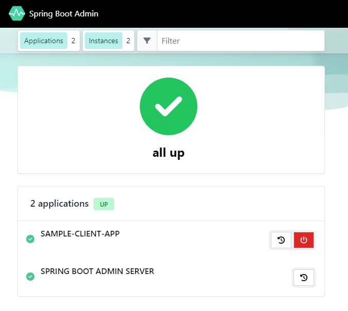 Poiché nei passaggi precedenti è stato associato il componente Amministrazione per Spring al componente Eureka Server per Spring, il componente Amministrazione abilita l'individuazione del servizio e consente di gestirlo contemporaneamente tramite il dashboard di Amministrazione per Spring.