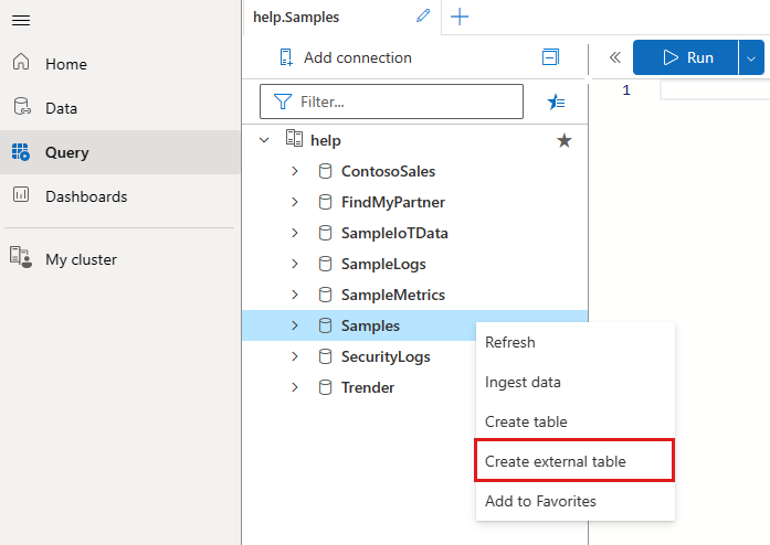 Fare clic con il pulsante destro del mouse sul database in cui si desidera creare la tabella esterna. Selezionare Crea tabella esterna.