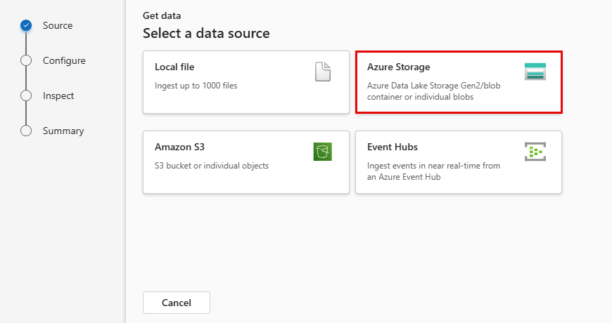 La procedura guidata Recupera dati non supporta l'inserimento da Archiviazione di Azure tramite endpoint privati o endpoint privati gestiti. Seguire le istruzioni per ottenere dati usando il comando .ingest .