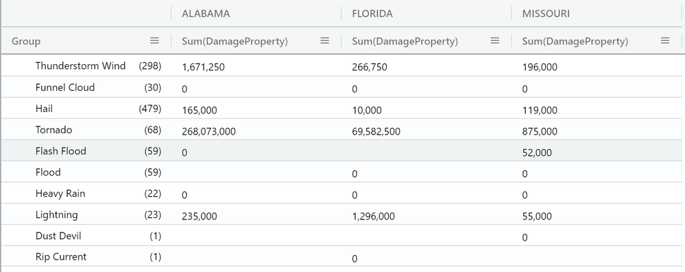Trascinare le colonne nelle sezioni Gruppi di righe, Valori, Etichette di colonna . Ad esempio, se si trascina EventType in Gruppi di righe; DamageProperty to Values e State to Column labels ,then the result should look like the following pivot table.