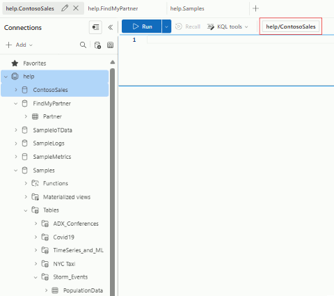 Usare l'editor di query per interagire con i dati eseguendo query nel contesto di un database specifico. Per impostare il contesto di query, selezionare il database pertinente nel pannello sinistro. Il contesto della query viene visualizzato nella barra degli strumenti superiore.
