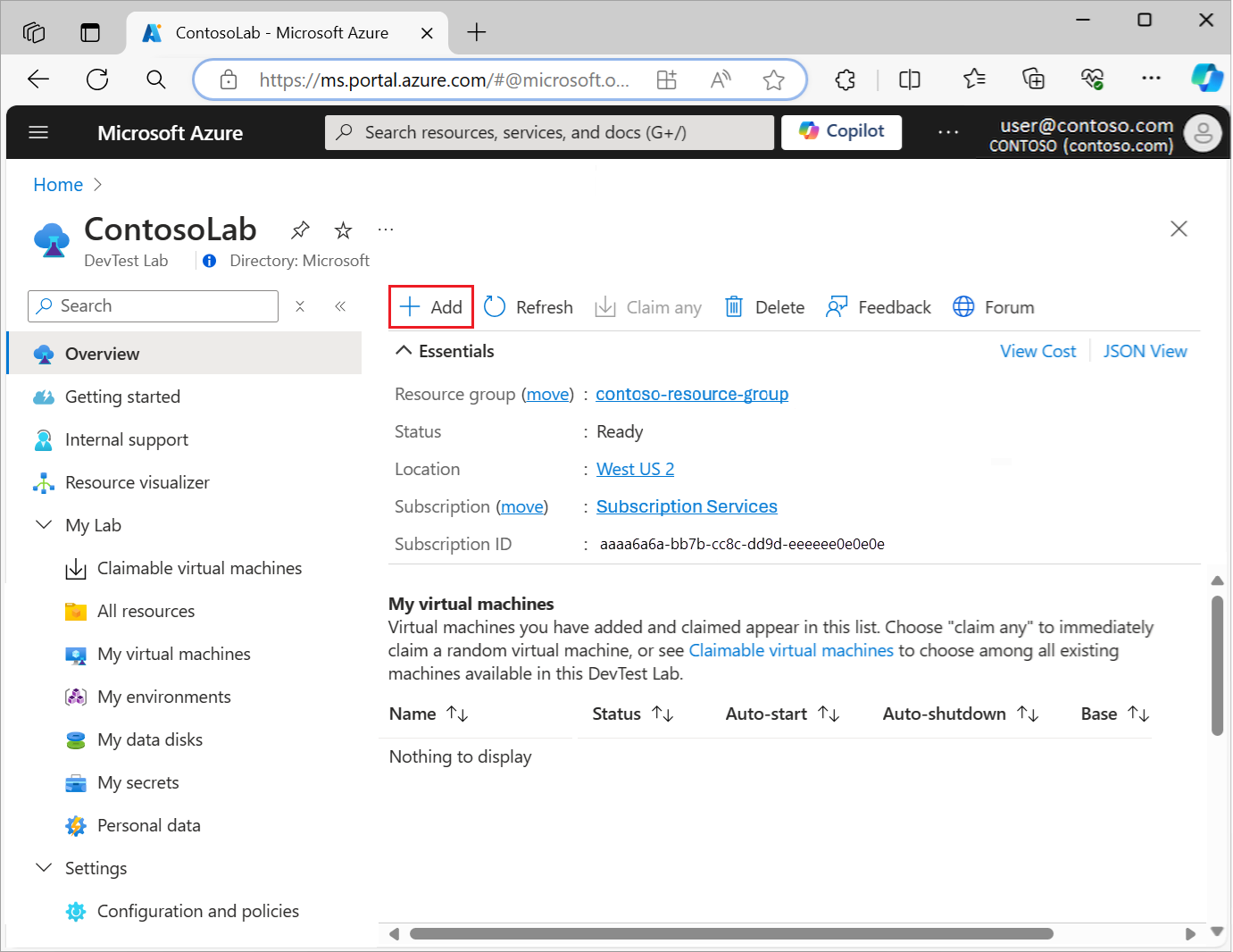 Nella pagina Panoramica del lab, selezionare Aggiungi per creare una nuova macchina virtuale.