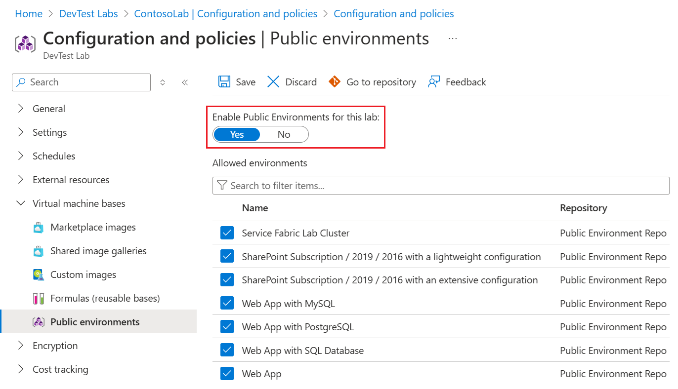 È possibile abilitare l'accesso al laboratorio al repository di modelli pubblici di DevTest Labs per un nuovo laboratorio o uno esistente. Quando si abilita l'accesso al repository, è possibile selezionare i modelli di ambiente da rendere disponibili agli utenti del lab.