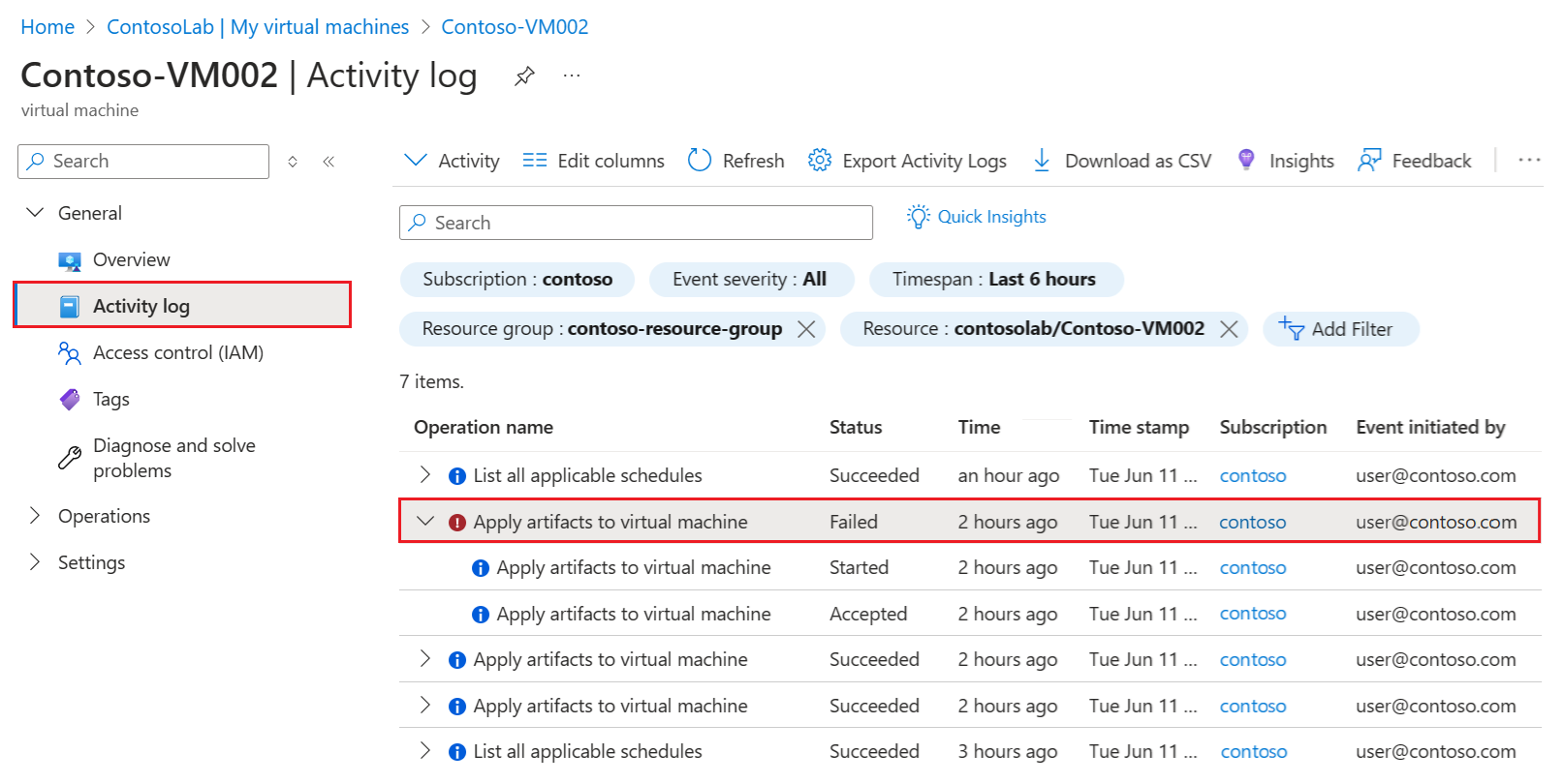 Passare alla pagina Log attività per la macchina virtuale del laboratorio e individuare l'artefatto con lo stato Non riuscito.