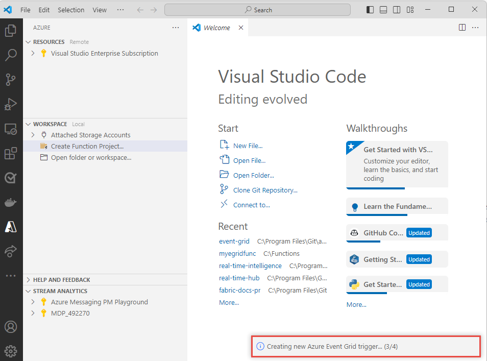 Creare una funzione con un trigger di Griglia di eventi usando Visual Studio Code
