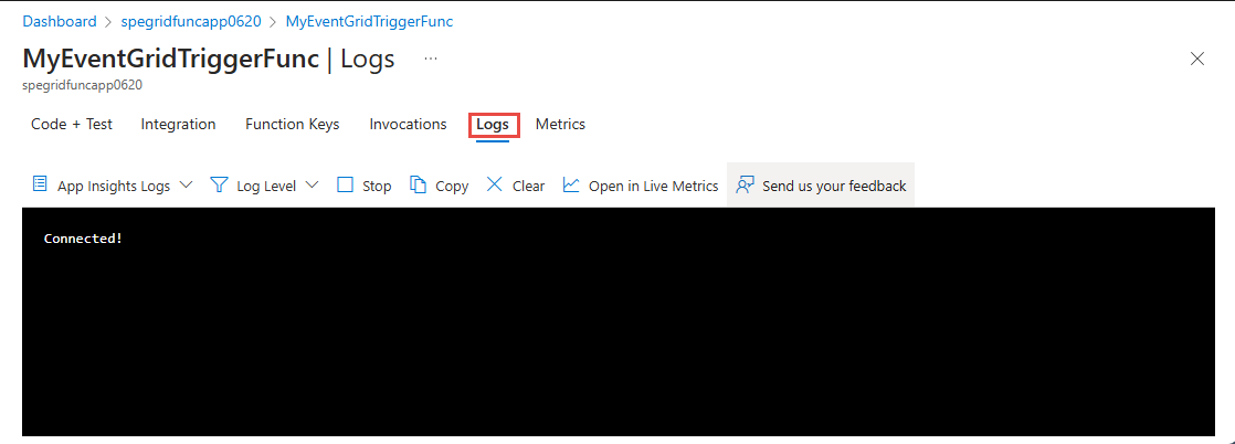 Passare alla scheda Log . Mantenere aperta questa scheda per visualizzare i messaggi registrati quando si invia un evento a un argomento di Griglia di eventi più avanti in questo articolo.