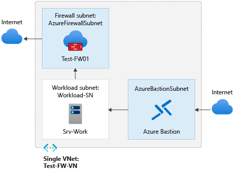 Per questo articolo viene creata una singola rete virtuale semplificata con tre subnet per semplificare la distribuzione. Per le distribuzioni di produzione è consigliabile un modello hub e spoke, in cui il firewall si trova nella propria rete virtuale. I server del carico di lavoro si trovano nelle reti virtuali associate all'interno della stessa area con una o più subnet.