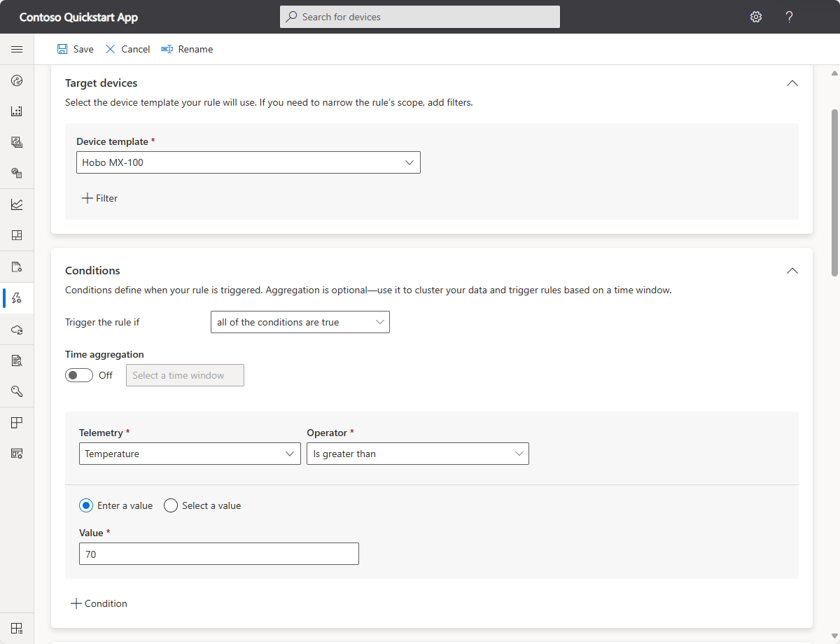 Le condizioni definiscono i criteri monitorati dalla regola. In questa esercitazione si configura la regola per l'avvio quando la temperatura supera i 70° F.