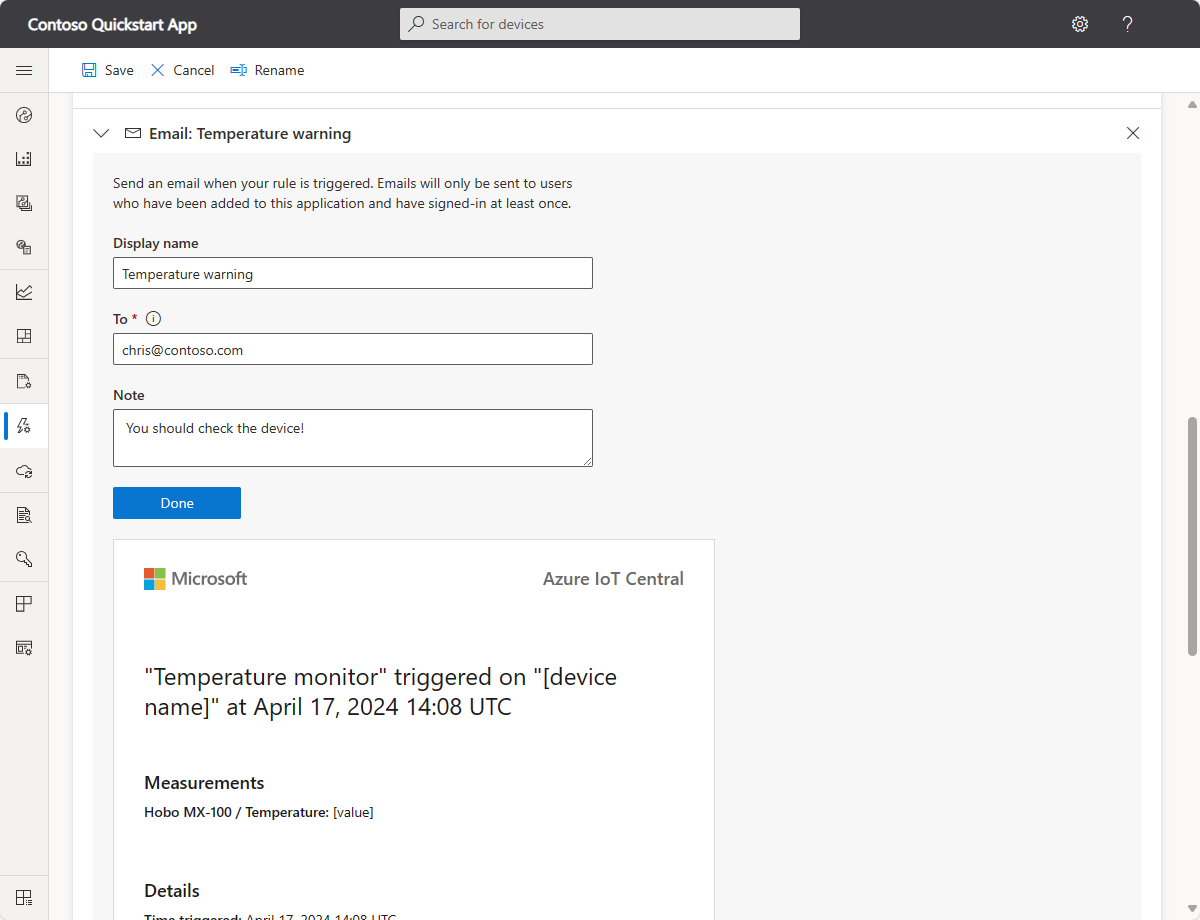 Immettere Avviso di temperatura come nome visualizzato per l'azione, l'indirizzo di posta elettronica nel campo A e Dovresti controllare il dispositivo! come nota da visualizzare nel corpo del messaggio di posta elettronica.