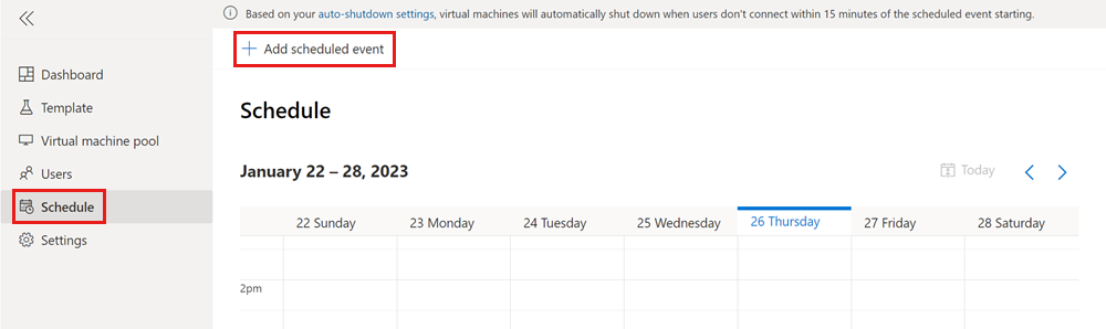 Oltre a far avviare manualmente la macchina virtuale lab a ogni utente del lab, è possibile, in alternativa, creare una pianificazione lab per avviare e arrestare automaticamente le macchine virtuali lab in base al calendario di formazione. Azure Lab Services supporta eventi singoli o pianificazioni ricorrenti.