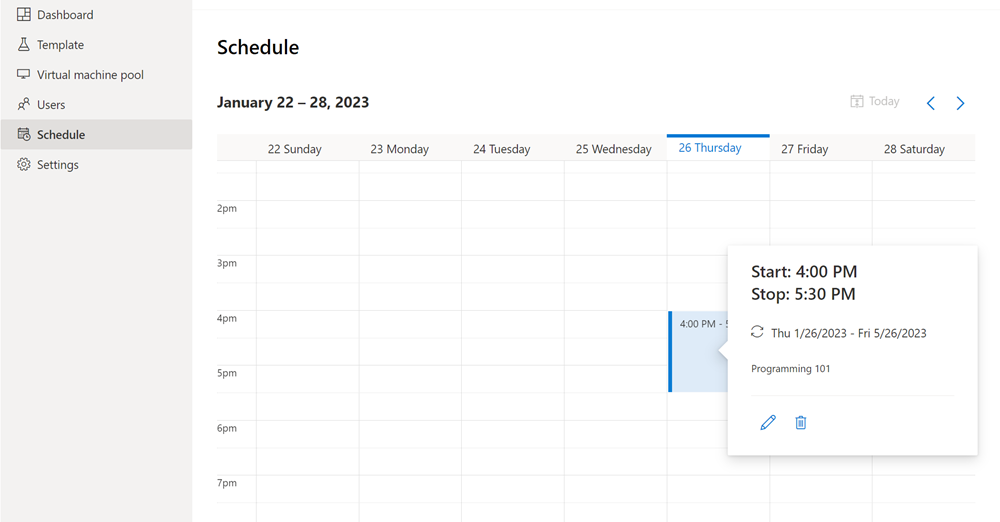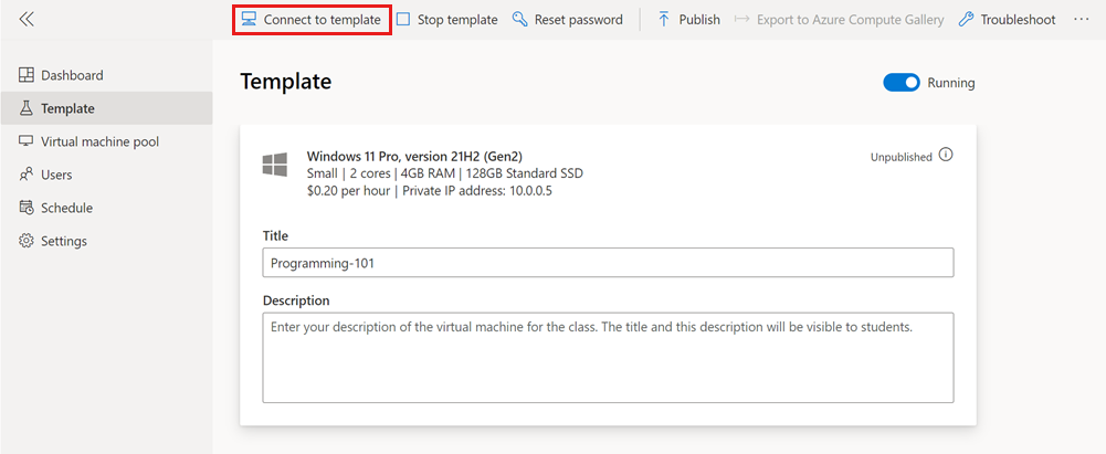 È stato creato un lab personalizzato per la formazione in classe, è stata creata una pianificazione lab ricorrente e gli utenti sono stati invitati a registrarsi per il lab. Successivamente, gli utenti del lab possono connettersi alla macchina virtuale lab tramite Desktop remoto.