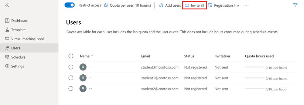 Nella pagina Utenti per il lab selezionare Invita tutti sulla barra degli strumenti.