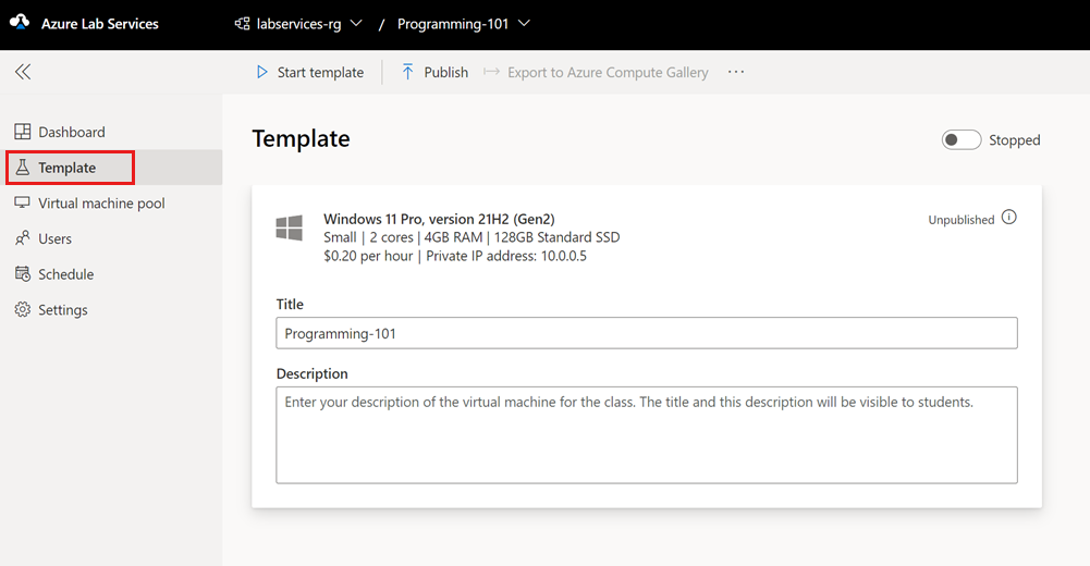 È stato personalizzato il modello di lab per il corso. Dopo la pubblicazione ogni macchina virtuale nel lab avrà la stessa configurazione della macchina virtuale modello.
