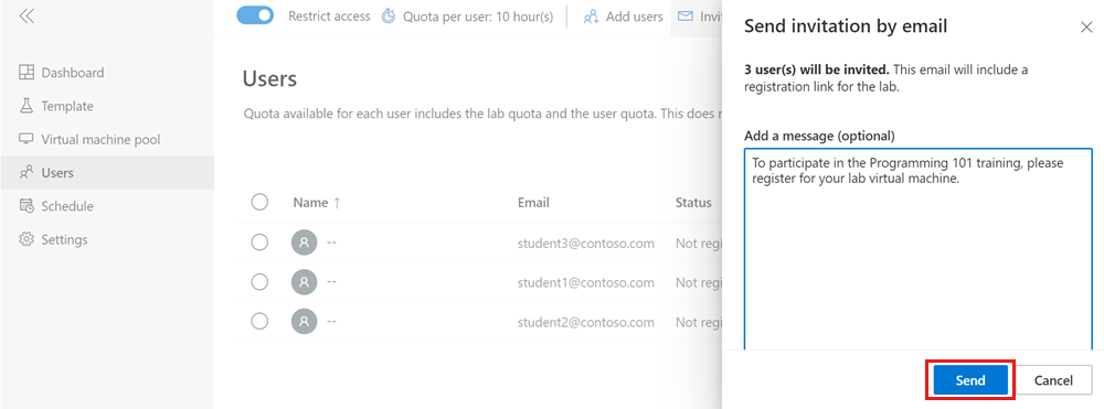 Dopo averli aggiunti al lab, gli utenti possono registrarsi per il lab usando un collegamento di registrazione per il lab. È possibile fornire manualmente il collegamento agli utenti oppure lasciare che sia Azure Lab Services ad inviare inviti tramite posta elettronica.
