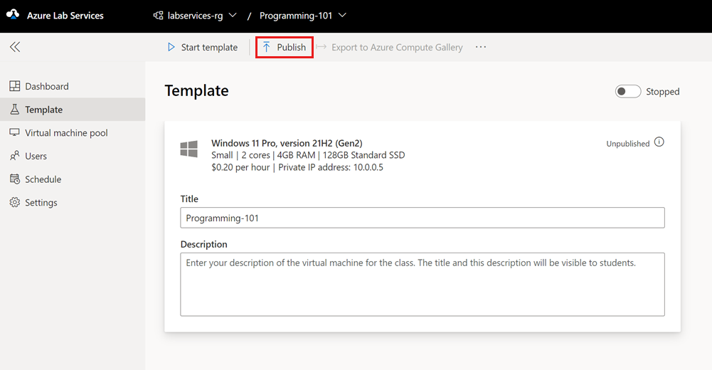 Tutte le macchine virtuali nel lab condividono la stessa configurazione del modello di lab. Prima che Azure Lab Services crei macchine virtuali lab per il lab, è necessario pubblicare il lab. È possibile specificare il numero massimo di macchine virtuali lab create da Azure Lab Services. È anche possibile modificare il numero di macchine virtuali lab in una fase successiva.