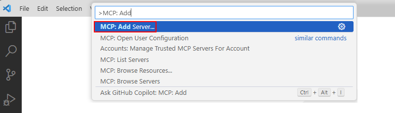 In Visual Studio Code, dal menù Visualizza, selezionare Riquadro comandi. Individuare e selezionare MCP: Aggiungi server.