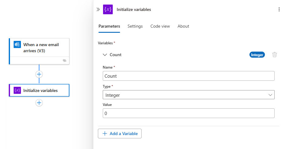 Aggiungere l'azione Inizializza variabile per creare una variabile integer denominata Count che ha un valore iniziale impostato su 0.