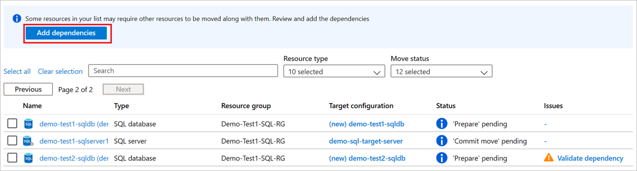 Azure Resource Mover attualmente non sposta SQL Server tra aree. È prima necessario assegnare un'istanza di SQL Server di destinazione nell'area di destinazione e quindi eseguire il commit dello spostamento.