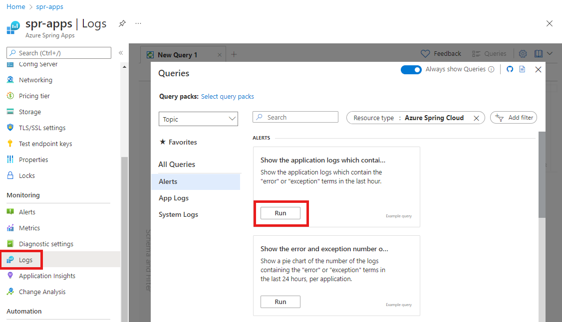 Nel riquadro Query in Mostra i registri applicazioni che contengono i termini "errore" o "eccezione", selezionare Esegui.