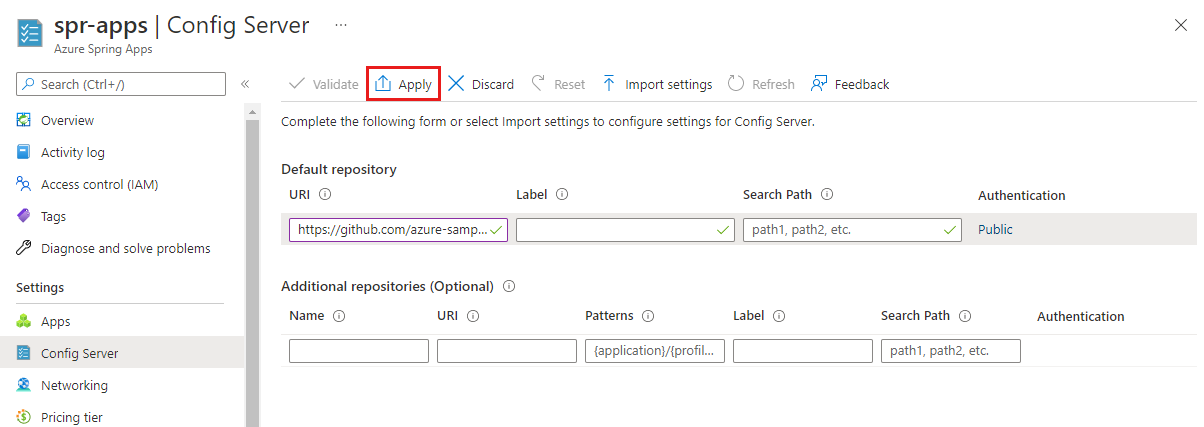 https://github.com/azure-samples/spring-petclinic-microservices-config.Selezionare Convalida. La convalida controlla lo schema e l'accessibilità del repository Git per assicurarsi che sia corretto.