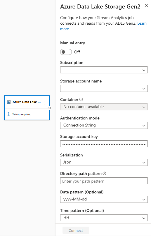 Per aggiungere un ADLS Gen2 come input di streaming per il processo, selezionare ADLS Gen2 inInputdalla barra multifunzione. Compilare quindi le informazioni necessarie nel riquadro destro per connettere ADLS Gen2 al processo. Per altre informazioni sui dettagli di ogni campo, vedere Trasmettere dati da ADLS Gen2 al processo di analisi di flusso