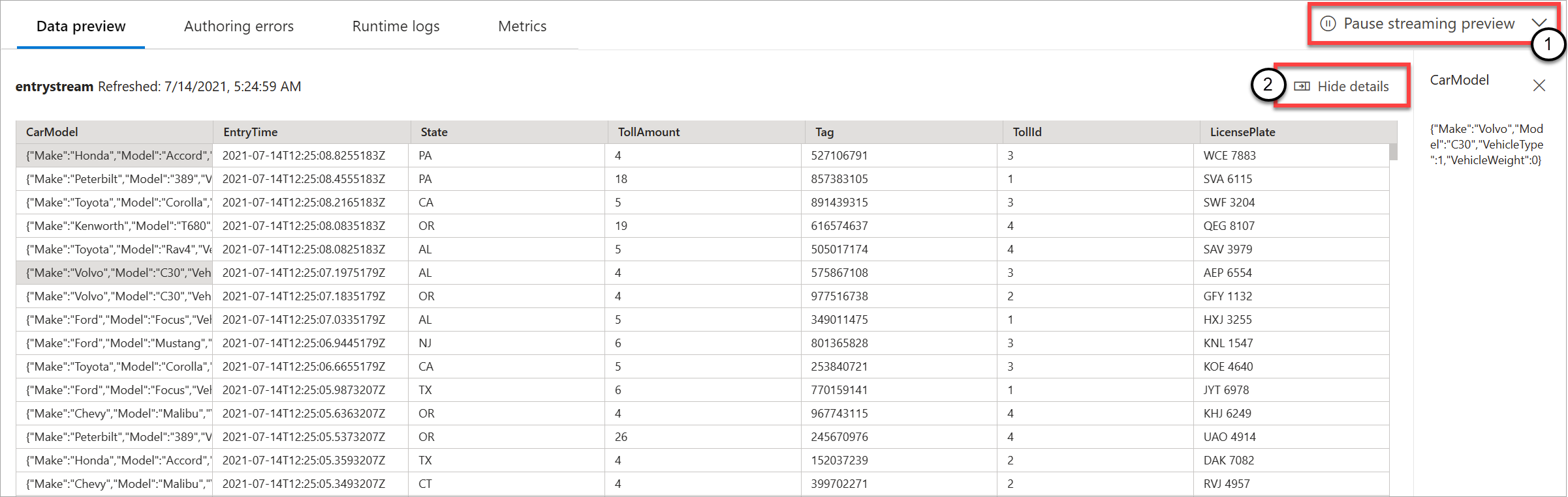 È possibile aggiornare l'anteprima selezionando Aggiorna anteprima statica (1). Quando si aggiorna l'anteprima, il processo di analisi di flusso accetta nuovi dati dall'input e valuta tutte le trasformazioni. In seguito, invia nuovamente l'output con tutti gli aggiornamenti che potrebbero essere stati eseguiti. L'opzione Mostra/Nascondi dettagli è disponibile anche (2).
