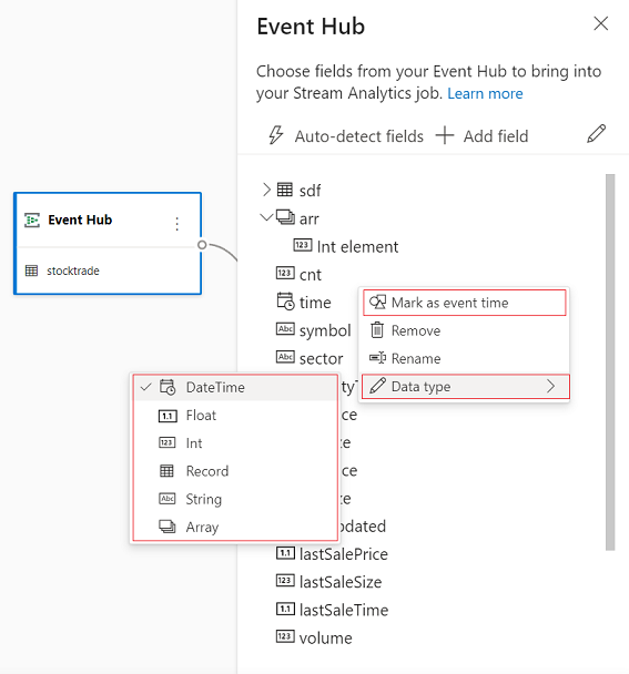 È possibile modificare i nomi dei campi, rimuovere il campo, modificare il tipo di dati oppure modificare l'ora dell'evento (Contrassegna come ora evento: clausola TIMESTAMP BY in caso di campo di tipo datetime), selezionando il simbolo a tre punti accanto a ogni campo. È anche possibile espandere, selezionare e modificare i campi annidati dai messaggi in arrivo, come illustrato nell'immagine seguente.