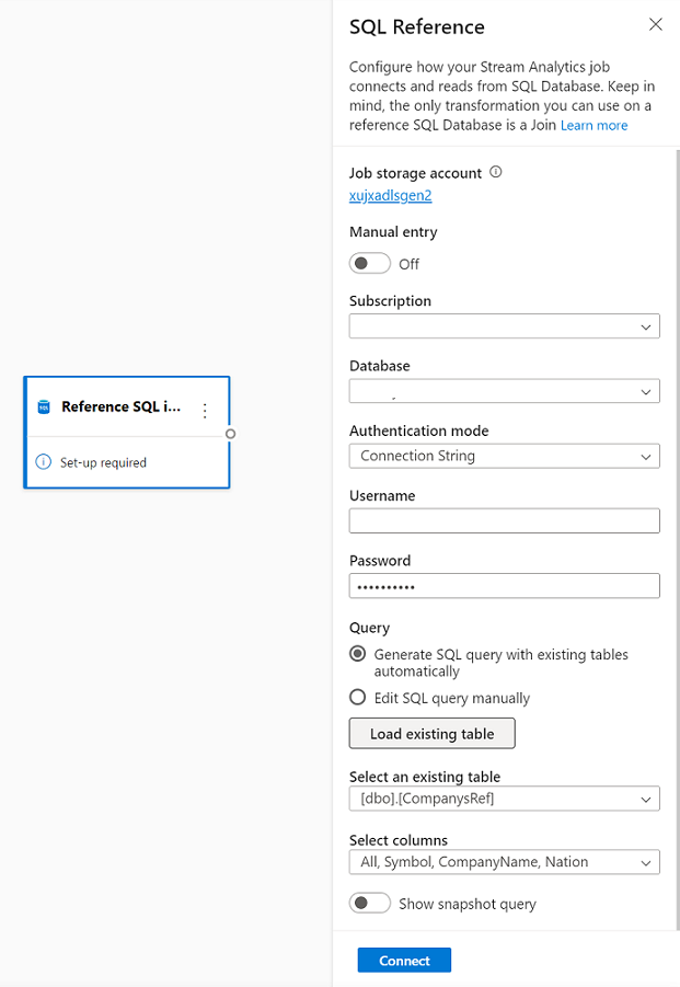 È possibile usare il database SQL di Azure come dati di riferimento per il processo di analisi di flusso nell'editor senza codice. Per maggiori informazioni, vedere la sezione relativa al database SQL in Usare i dati di riferimento per le ricerche in Analisi di flusso.