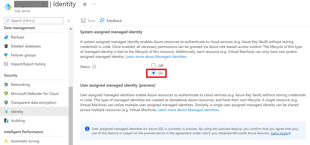 Passare al server logico di Azure SQL, selezionare Identitàe quindi impostare Identità gestita assegnata dal sistema su Attivato.