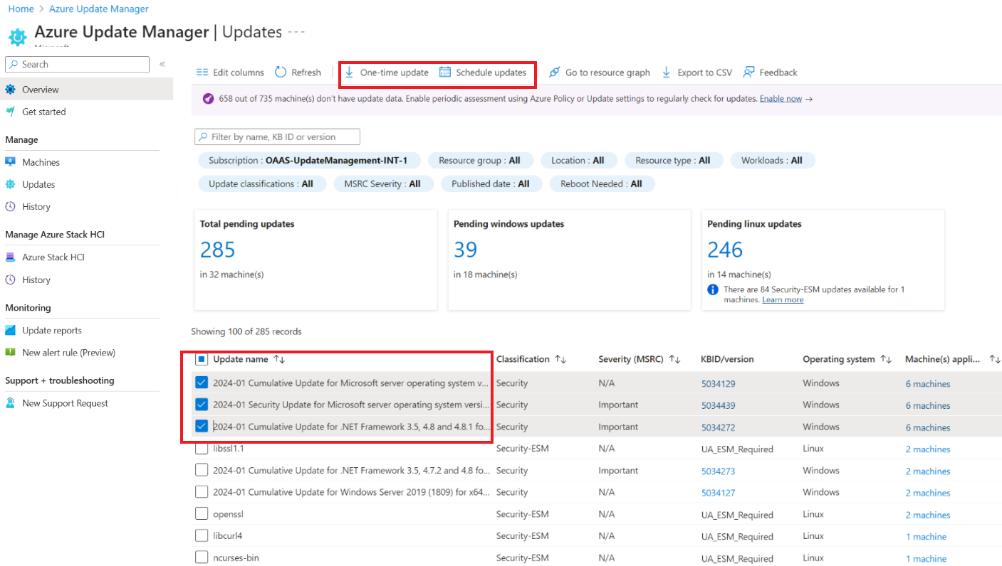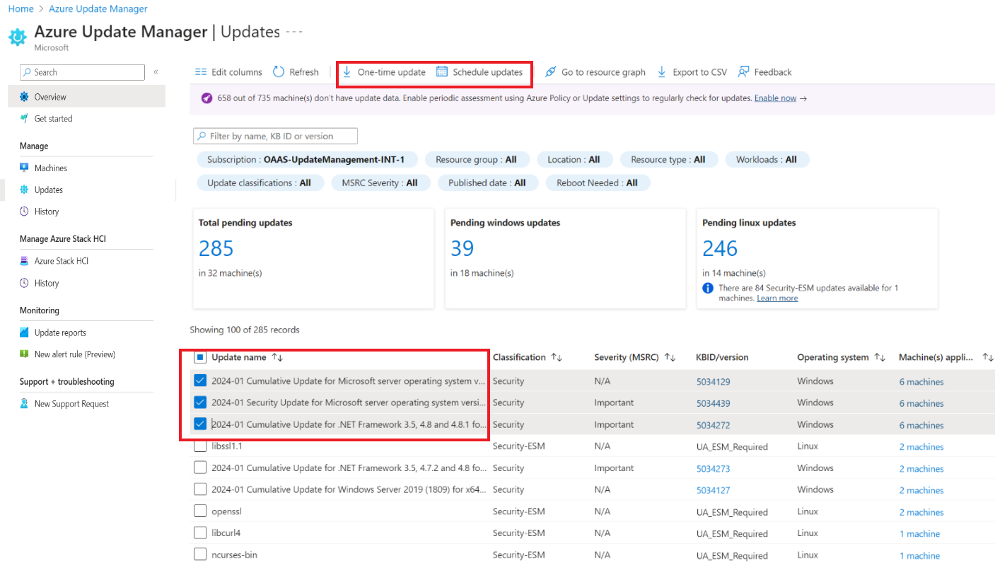 Filtrare gli aggiornamenti usando le opzioni di filtro nella parte superiore, ad esempio Gruppo di risorse, Posizione, Tipo di risorsa, Carichi di lavoro, Classificazioni degli aggiornamenti