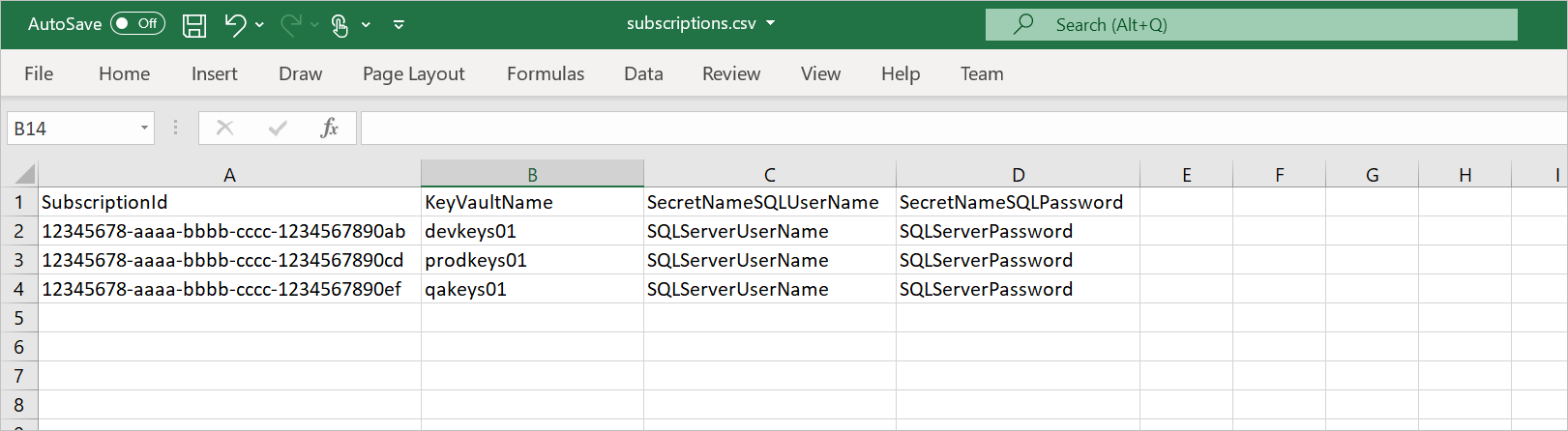 Prima di eseguire lo script, creare un file di .csv , ad esempio "C:\temp\Subscriptions.csv) con quattro colonne: