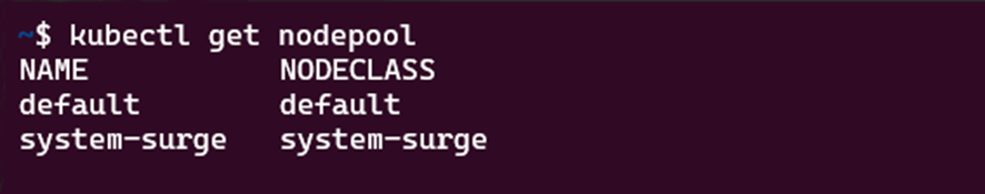 kubectl get nodepoolcomando . La risposta del comando sarà simile alla seguente:Verificare che il pool di nodi predefinito sia un pool di nodi Karpenter usando il