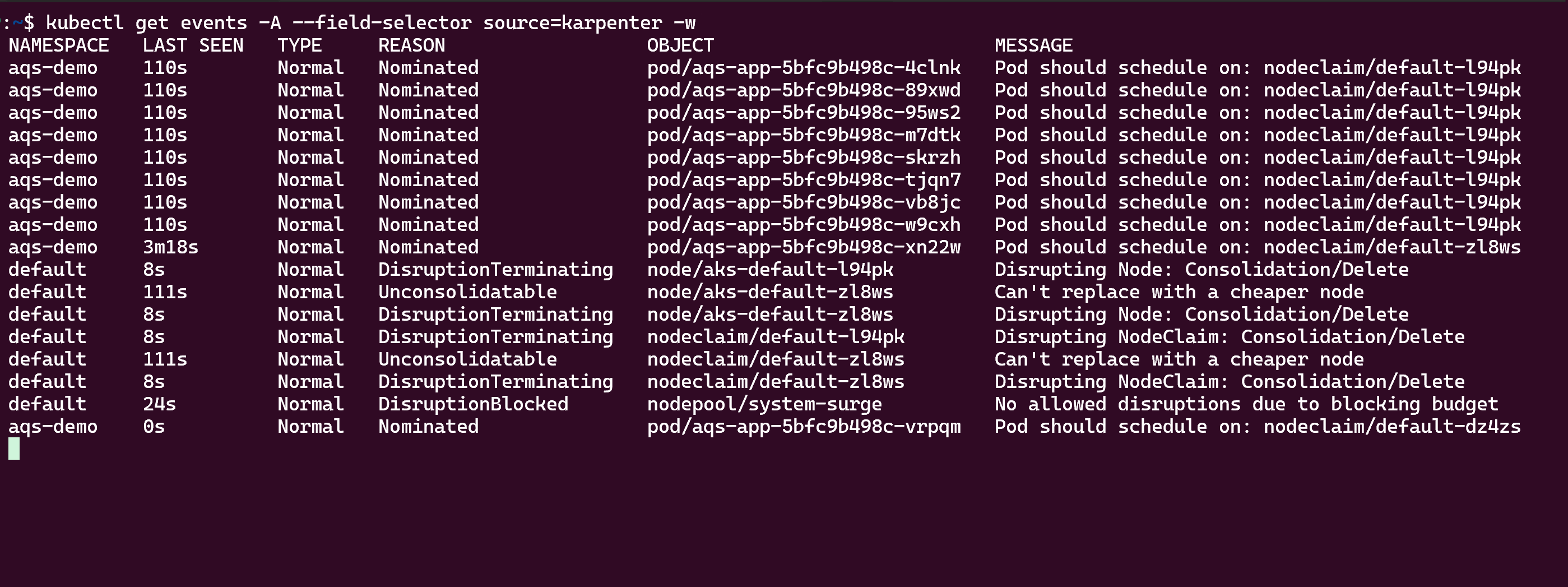 aks-defaultè aumentato da uno a tre. Se si arresta l'inserimento dei messaggi nella coda da parte dell'app producer, alla fine i consumer ridurranno la profondità della coda al di sotto della soglia e KEDA e Karpenter verranno dimensionati. Se si usa k9s, verrà visualizzato un risultato simile al seguente:Infine, è possibile visualizzare l'attività di scalabilità automatica karpenter usando il
