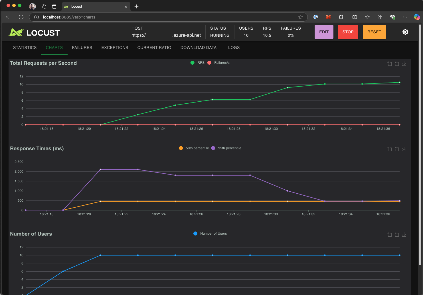 Nella pagina Avvia nuovo test di carico esaminare i campi di input e fare clic su Avvia. Locust inizia a inviare richieste, registrare eventuali errori e tenere traccia delle statistiche sulle prestazioni.