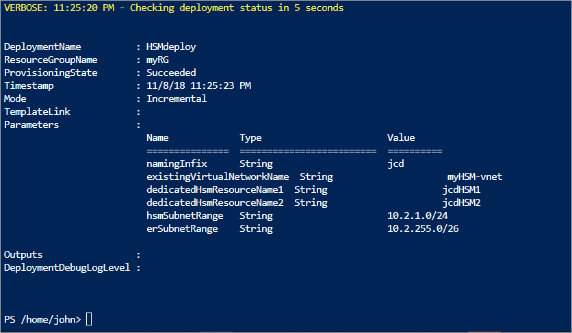 When completed successfully, shown by "provisioningState": "Succeeded", you can sign in to your existing virtual machine and use SSH to ensure availability of the HSM device.
