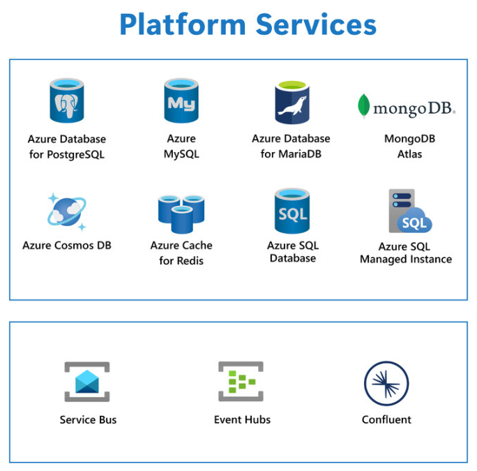 Oltre a offrire diverse opzioni per l'esecuzione del codice Java, Azure offre un'ampia gamma di servizi completamente gestiti per supportare le esigenze del database, tra cui Database di Azure per PostgreSQL, Database di Azure per MySQL, MongoDB Atlas, Azure Cosmos DB, database SQL di Azure e Istanza gestita di SQL di Azure. Lo stesso vale per la messaggistica, con opzioni che includono bus di servizio di Azure, Hub eventi di Azure e Apache Kafka per Confluent Cloud.
