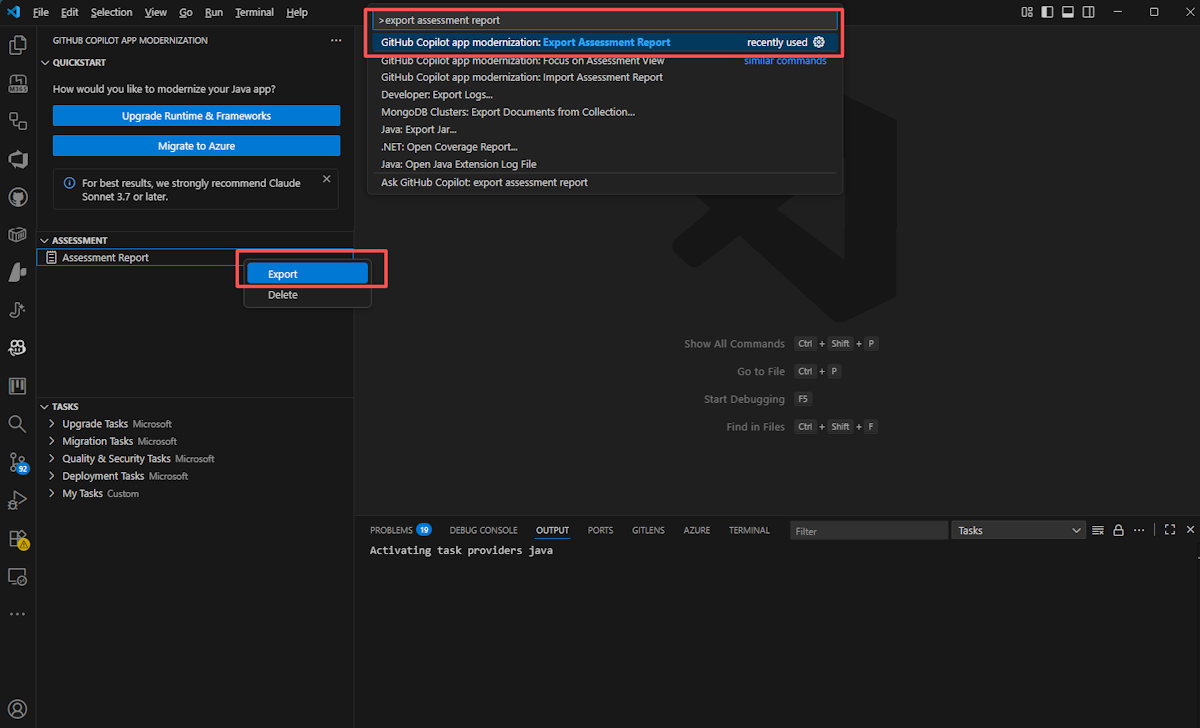 Per esportare un report di valutazione dalla modernizzazione di GitHub Copilot, fare clic con il pulsante destro del mouse su Report di valutazione e quindi scegliere Esporta nella sezione di valutazione oppure premere CTRL+MAIUSC+P e quindi cercare il report di valutazione dell'esportazione.