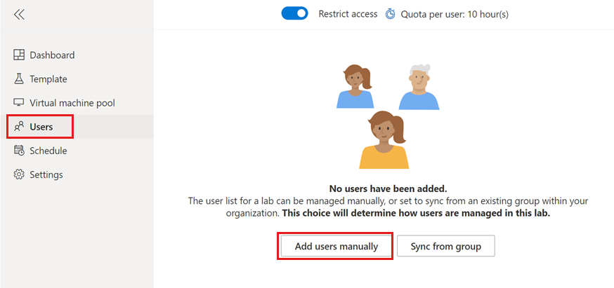 Selezionare la pagina Utenti per il lab e selezionare Aggiungi utenti manualmente.