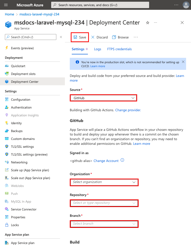 1. In Origine, selezionare GitHub. Per impostazione predefinita, GitHub Actions è selezionato come provider di compilazione.
