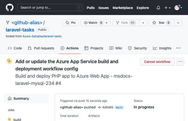 Si viene reindirizzati al repository GitHub dove si noterà che l'azione GitHub è in esecuzione. Il file del flusso di lavoro definisce due fasi separate, compilare e distribuire.