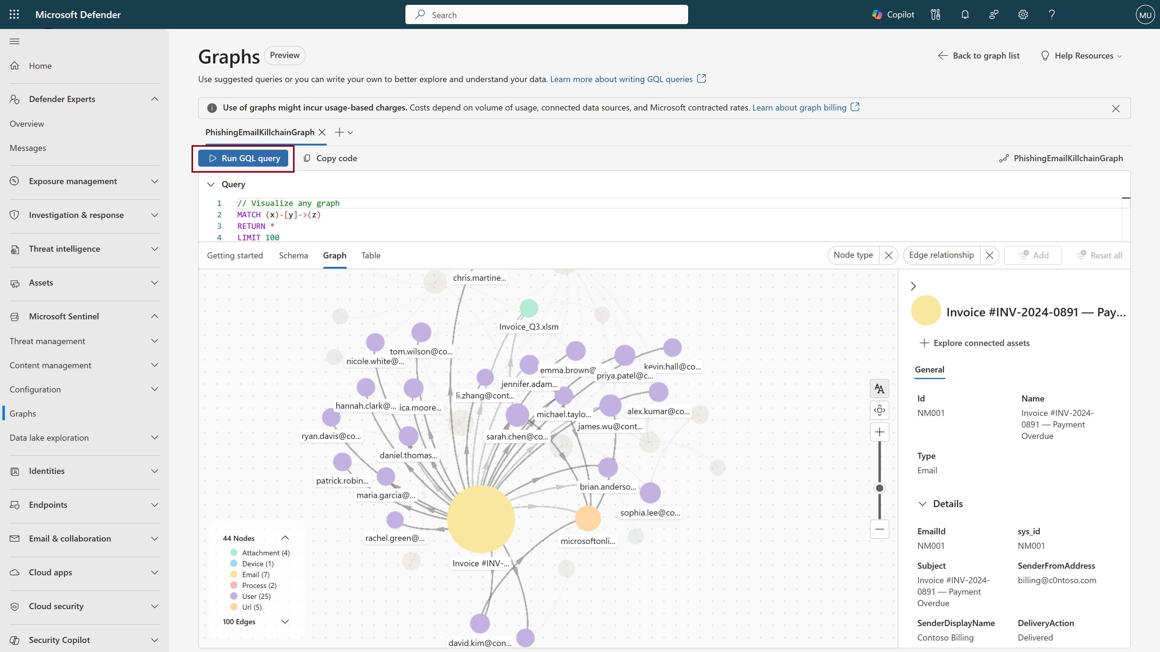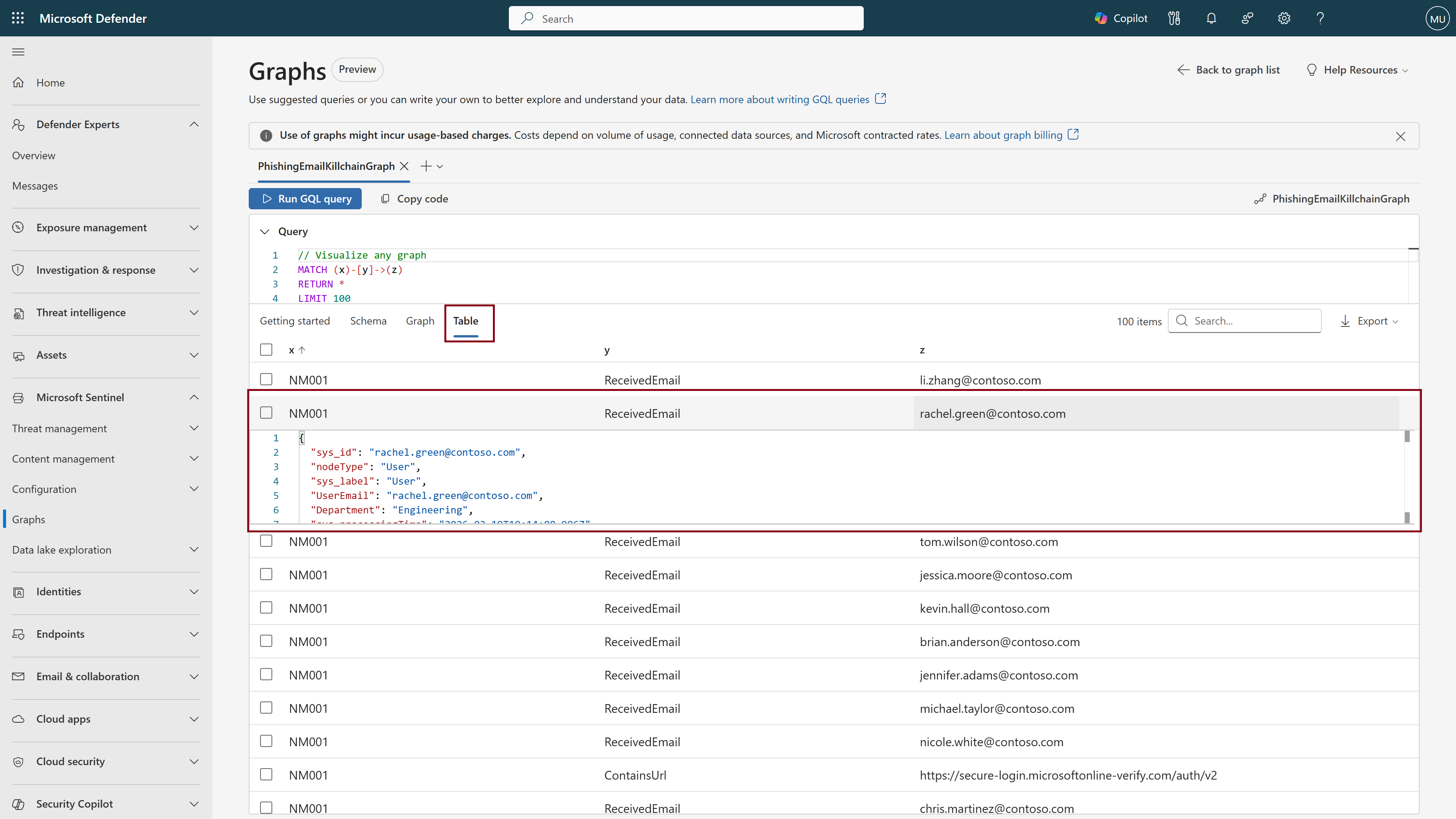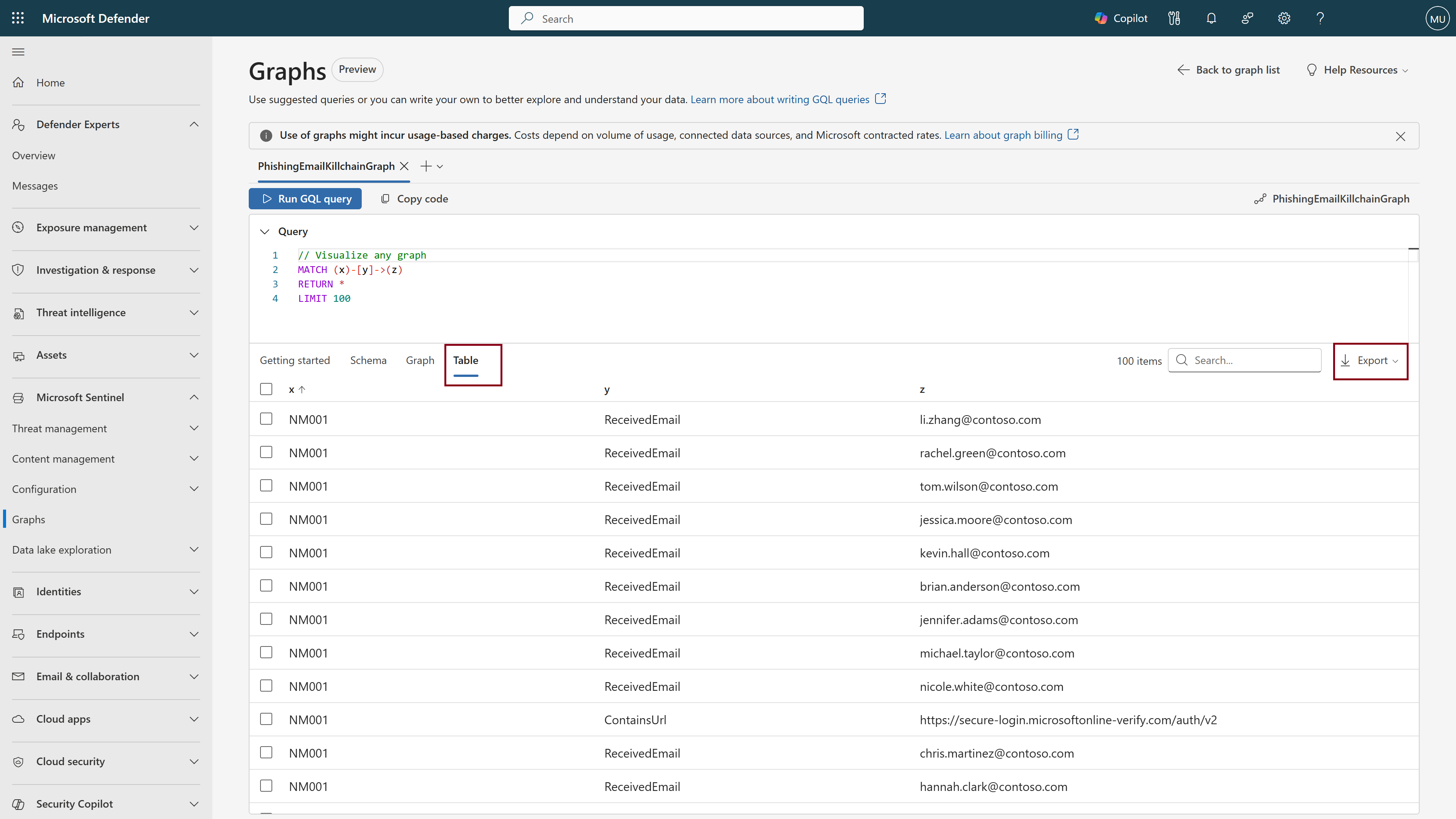 L'esperienza dei grafici nel portale di Microsoft Defender consente di eseguire indagini interattive basate su gragrafi sui grafici personalizzati, ad esempio l'uso di un grafo creato per l'analisi del phishing per valutare rapidamente l'impatto di un evento imprevisto recente, profilare l'utente malintenzionato e tracciarne i percorsi tra i dati di telemetria Microsoft e i dati di terze parti. Questa esperienza consente di eseguire query di gragrafi per visualizzare le informazioni dettagliate più importanti per l'organizzazione e supporta l'attraversamento ad hoc del grafico in modo da poter analizzare rapidamente le entità di interesse. È possibile studiare lo schema del grafo per comprendere le relazioni definite nel grafico e usare uno dei metadati visualizzati per restringere i risultati. È possibile convalidare rapidamente i risultati con la vista tabella ed esportarli per semplificare l'integrazione in qualsiasi flusso di lavoro preesistente. Usare Jupyter Notebooks in Microsoft Visual Studio Code per creare e generare i grafici personalizzati, quindi usare l'interfaccia di grafo in Microsoft Sentinel per eseguire query e visualizzare i grafici personalizzati.