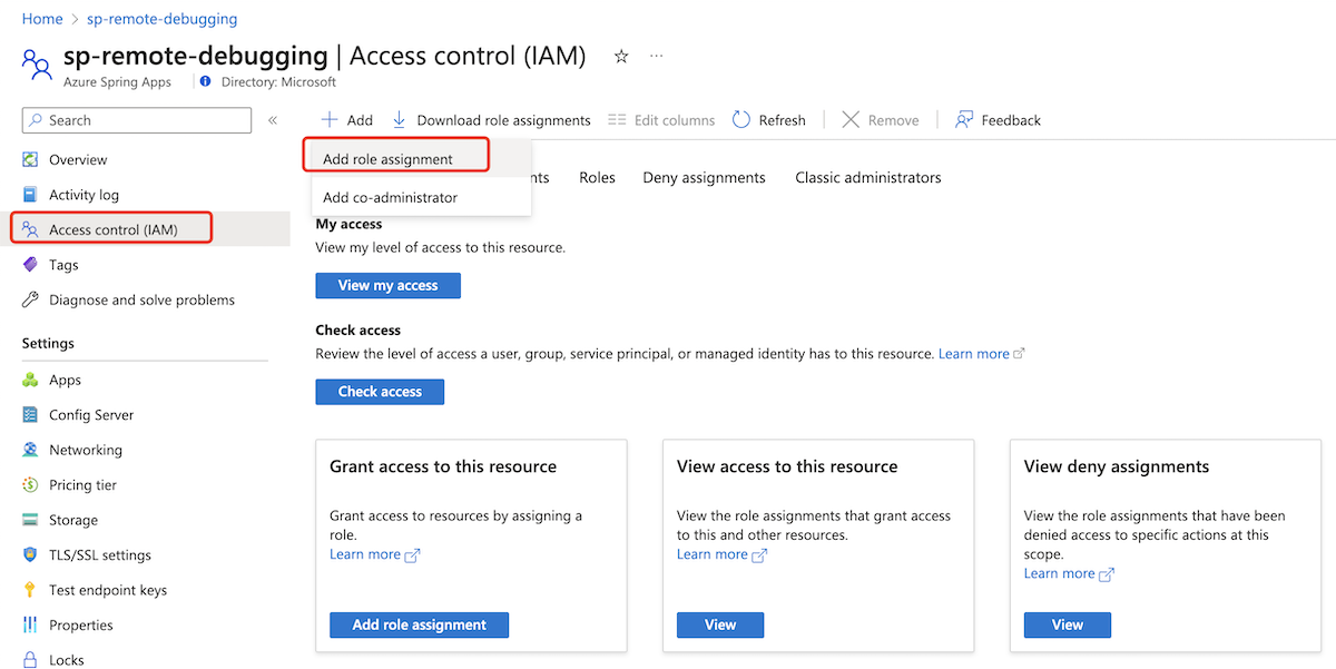 Per eseguire il debug remoto di un'istanza dell'app, è necessario avere il ruolo Azure Spring Apps Remote Debugging Role, che include l'autorizzazione per l'azione Microsoft.AppPlatform/Spring/apps/deployments/remotedebugging/action dati.