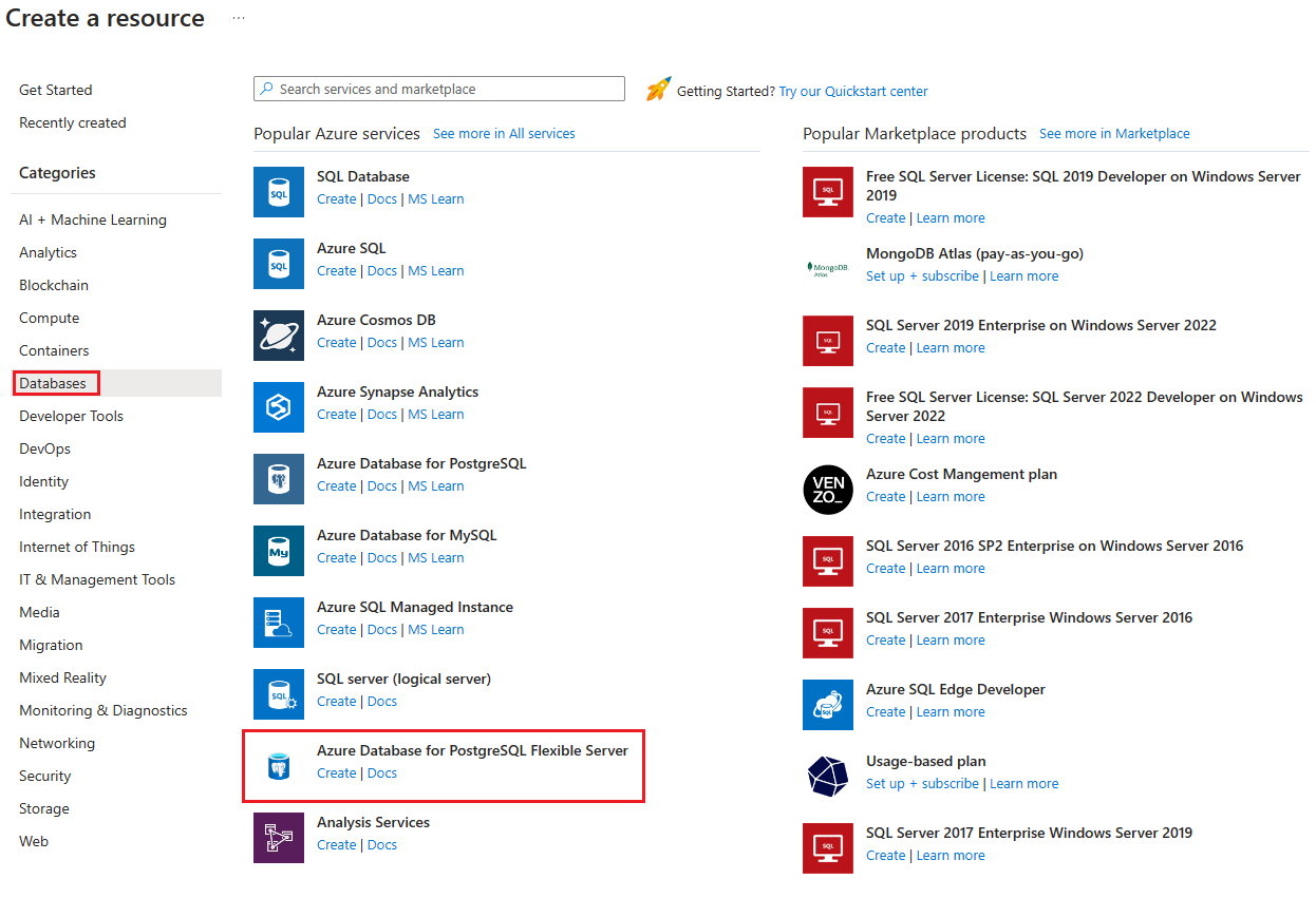 Selezionare Database>Server flessibile di Database di Azure per PostgreSQL.