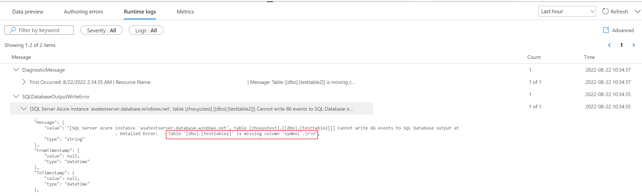 I log di runtime vengono visualizzati a livello di avviso, errore o informazioni quando un processo è in esecuzione. Questi log sono utili quando si vuole modificare la topologia o la configurazione del processo di analisi di flusso per la risoluzione dei problemi. È consigliabile attivare i log di diagnostica e inviarli all'area di lavoro Log Analytics in Impostazioni per ottenere altre informazioni dettagliate sui processi in esecuzione per il debug.