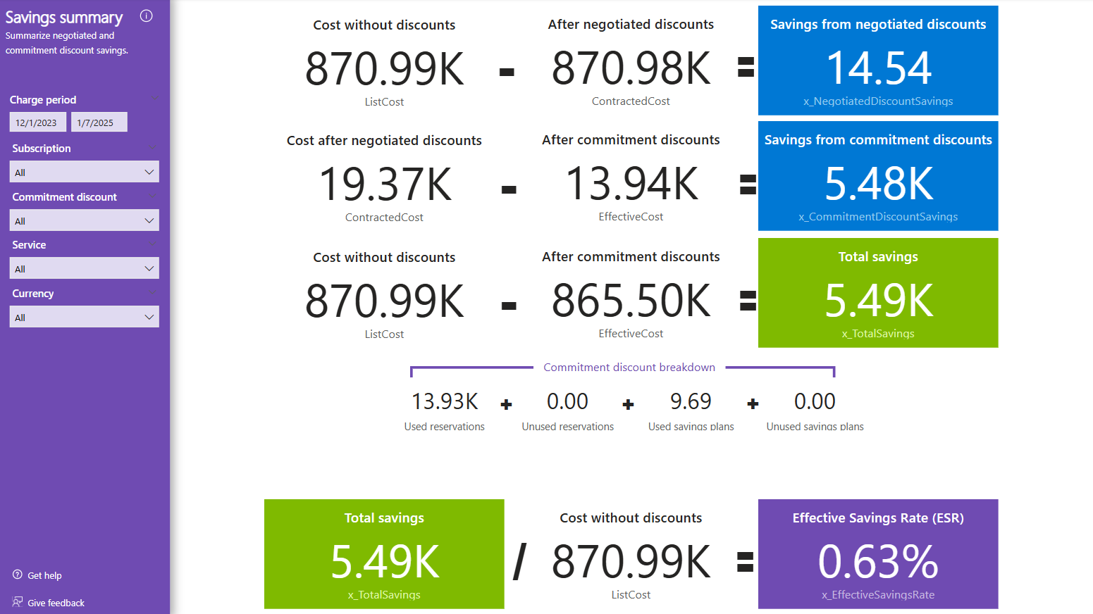 - Riepilogare i risparmi di sconto negoziati e di impegno per gli account EA e MCA.