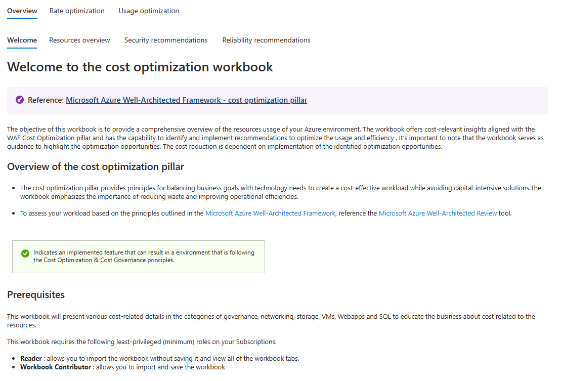 La cartella di lavoro di ottimizzazione è una cartella di lavoro di Monitoraggio di Azure che fornisce un'unica posizione per visualizzare l'ottimizzazione dei costi, modellata in base alle linee guida di Well-Architected Framework. Offre una gamma di informazioni dettagliate, tra cui: