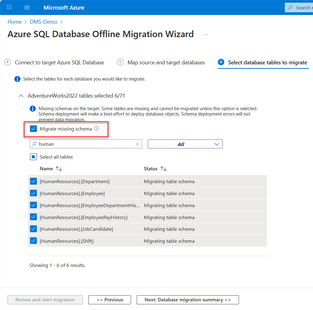 Successivamente, usare Selezionare tutte le tabelle per eseguire la migrazione di tutte le tabelle oppure usare la casella di immissione del testo per filtrare l'elenco delle tabelle e selezionare singole tabelle di cui eseguire la migrazione. Selezionare quindi Avanti: Riepilogo della migrazione del database.