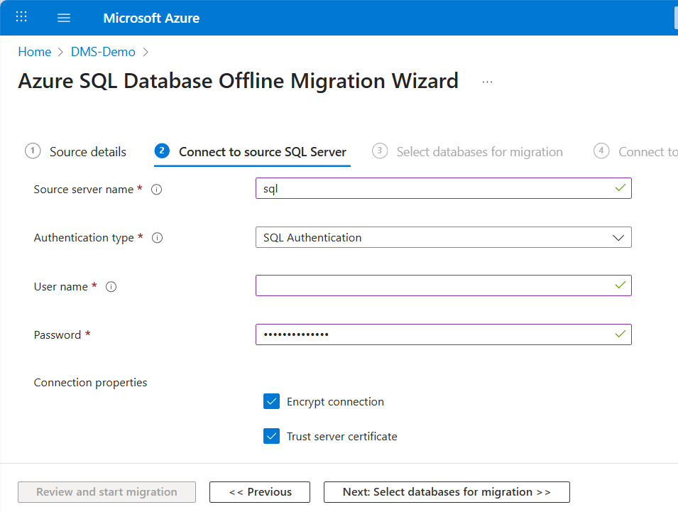 Nella scheda Connetti all'origine SQL Server specificare i dettagli di connessione e quindi selezionare Avanti: Selezionare i database per la migrazione: